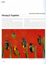Citting Gauguin, Van Gogh, Mondrian, and Dali as favorites, Chung is familiar with European traditions as well as Korean. Traditional Korean quilt patterns, Van Gogh's starry nights, and Dali's barren dreamscapes are a few influences that echo throughout his work. Chung appreciates simplicity in form and color; earlier works are structured even more abstractly. In step with Mondrian he repeats, leaves, and comes back to forms. His patchwork pattern is involved in thirteen recent paintings from 2006, but appears in works tracing as far back as 2000.